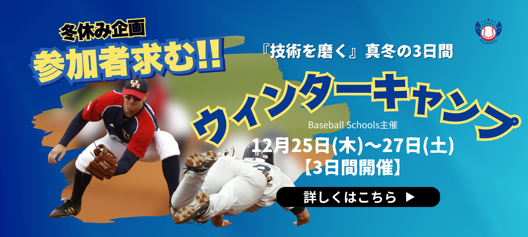 ベースボールスクールでは、この冬休みに特別企画として「ウィ… 続きを読む: 【冬休み限定】ウィンターキャンプ開催!打つ・投げる・守るを3日間で徹底強化しよう! - 【12月】ピッチング・スローイング専門教室 開催のお知らせ