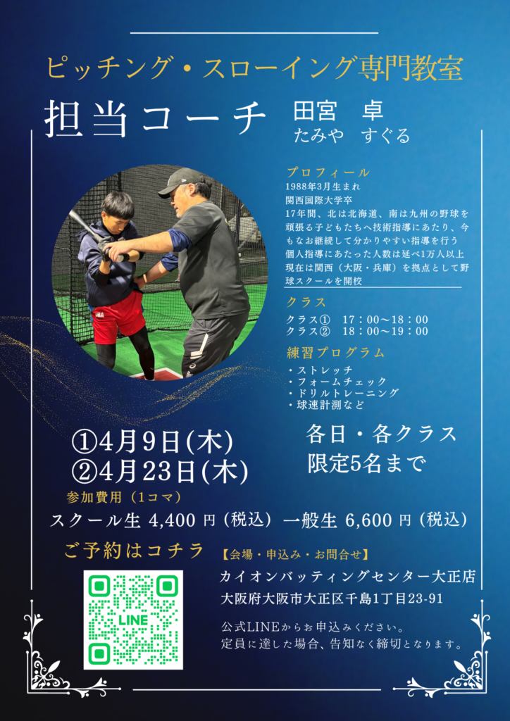 大阪・大正区の「カイオンバッティングセンター大正店」で開催される、ピッチング・スローイング専門教室のお知らせです⚾️